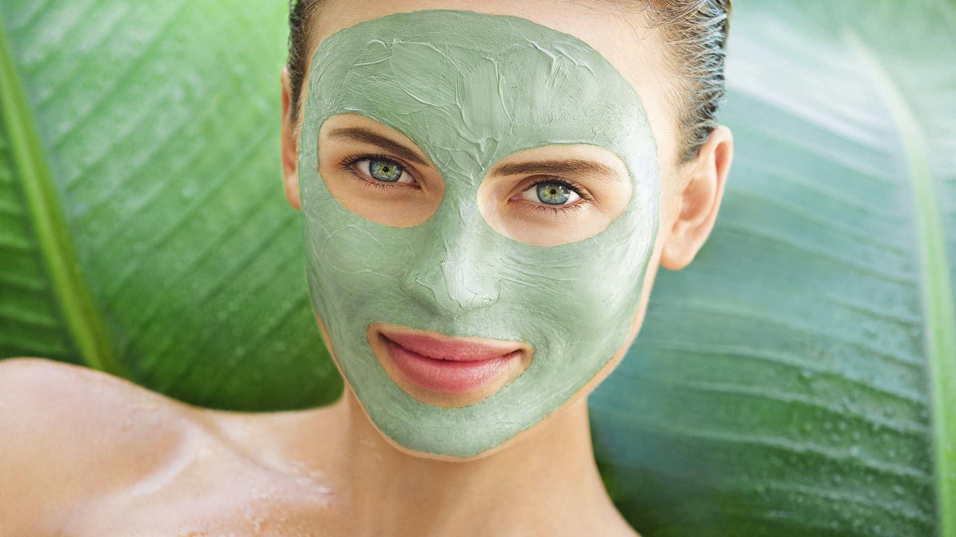 Portrait of a smiling young woman 25 years old with blue eyes, wet naked shoulders and tied hair, she is having a face care with a green mud mask, large banana tree leaves in background, France, Alpes Maritimes, Nice